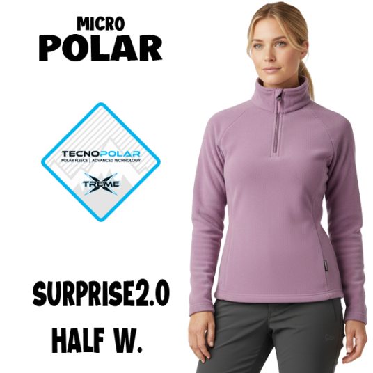 Surprise 2.0 Half W es una sudadera polar cálida, resistente y muy cómoda, diseñada para acompañarte tanto en tus actividades al aire libre como en el uso diario. Con un estilo versátil y femenino, se convierte en una prenda imprescindible para los días fríos.