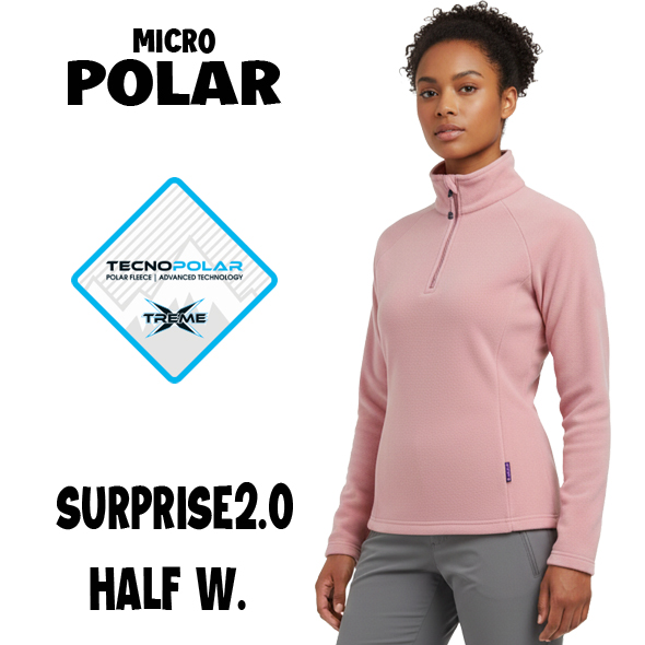 Surprise 2.0 Half W es una sudadera polar cálida, resistente y muy cómoda, diseñada para acompañarte tanto en tus actividades al aire libre como en el uso diario. Con un estilo versátil y femenino, se convierte en una prenda imprescindible para los días fríos.