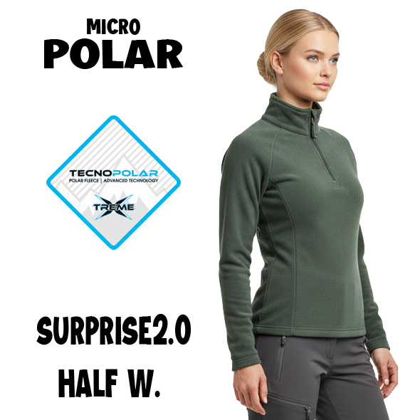 Surprise 2.0 Half W es una sudadera polar cálida, resistente y muy cómoda, diseñada para acompañarte tanto en tus actividades al aire libre como en el uso diario. Con un estilo versátil y femenino, se convierte en una prenda imprescindible para los días fríos.